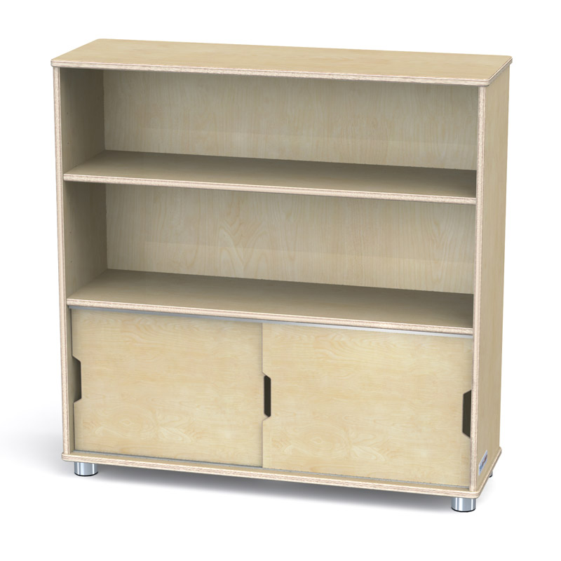 Multi-functional storage is robust enough for heavy books. Two shelves, one is adjustable. Bottom storage area allows items to be completely kept under wraps behind two sliding doors.