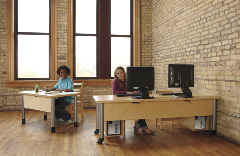 Perfect as a work surface or computer station for several kids. Designed to accommodate tablets and flat screens. Table surface is 1 1/8" thick, dual-laminated material reinforced with metal support rail. Tubular legs are stout, include levelers, and add a designer aesthetic. Extensive add-on options like Modesty Panels, CPU Booths, Leg Extenders, and Casters, make it easy for you to customize these tables to meet your growing needs.