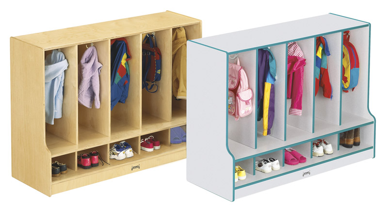 Step provides a perfect spot for toddlers to sit while handling their footwear. Double coat hooks. Five clear cubbie-trays available. Stationary.