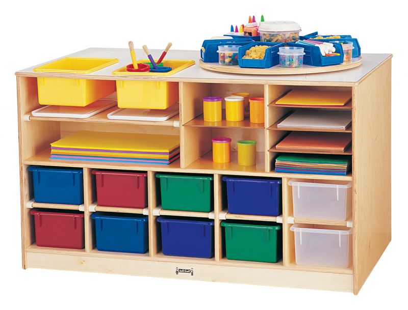 Two cubbie-tray cutouts and trays with lids allow tabletop art projects, experiments, or storage. E-Z to clean white laminate worktop. One side features ten optional cubbie-trays and shelves. Seven shelves and four optional tubs are on the other side.