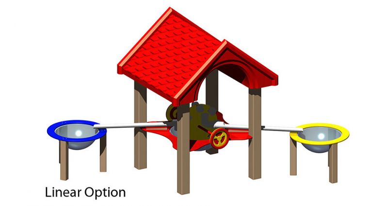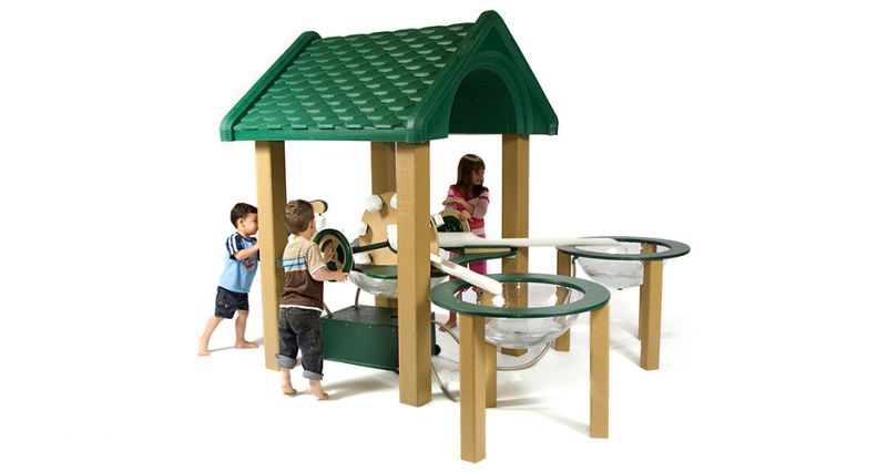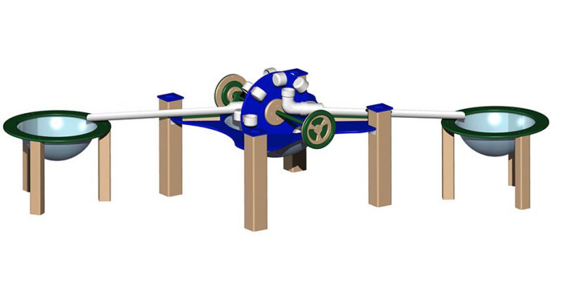 This completely recirculating water wheel system with kid-powered wheel and playground water pump fosters cooperation - the wheel can be turned opposite directions to drain into two different water bowls.