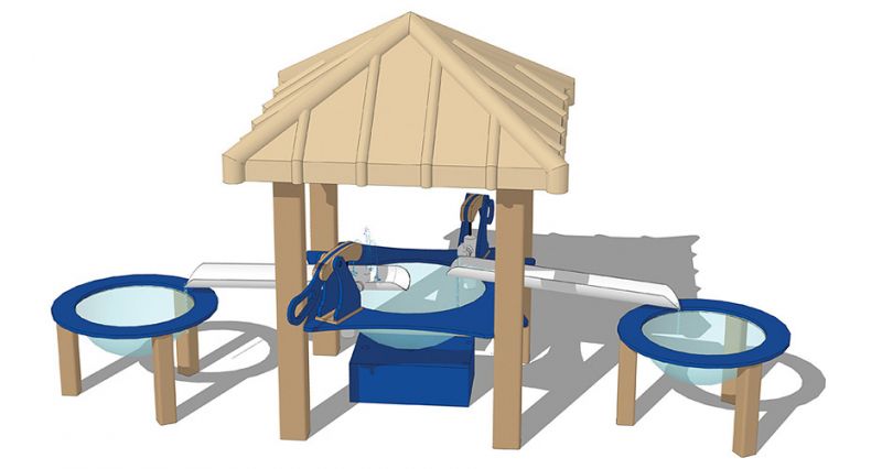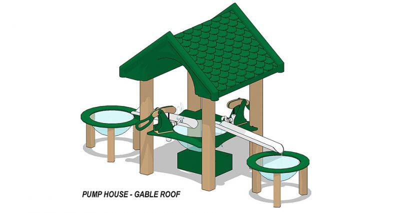 Two child-activated water pumps with different water fountains fill two troughs leading to two water bowls. Kids can build rock dams in the troughs or sail little boats all while getting wet and staying cool in hot summers. Water collects in the reservoir and then recirculates through a filter. Easily connects to a 18 hose for continuous water use if desired. Available with our without roof.