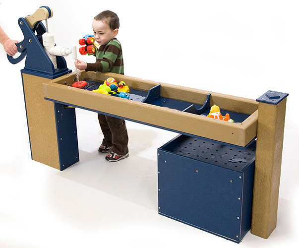 Troughs can be combined with child-activated water pump. Water toys, hose and drain-bucket not included.