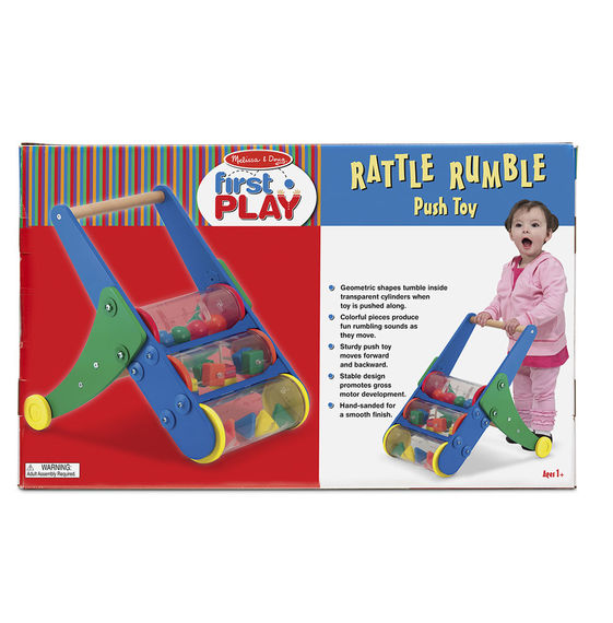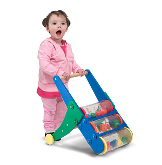 This sturdy push toy rattles and rumbles along with a toddler's early steps! Colorful toys tumble around in three clear canisters as this wooden toy moves forward or backward. It's a toddler classic that will have beginning walkers on a roll!