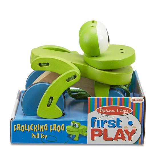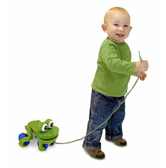 Boundless fun will accompany your toddler with this friendly wooden froggie pull toy. When pulled by its string, it playfully "hops" up and down with wiggling eyes, which adds to the excitement of those early steps. Brightly painted with non-toxic paint.