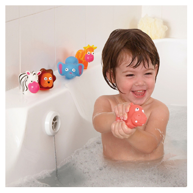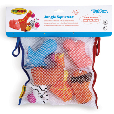 Soft squeezable lovable animals which all squirt water in fun ways: Elephant squirts out of trunk, Lion out of whiskers, Hippo out of nose and more. Great for tub or pool. Includes a FREE mesh storage bag.