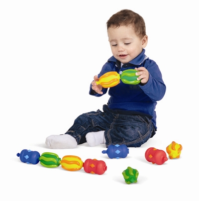 Colorful and textured snap together beads with a release pressure suitable for 1 year and older. Highly pronounced lumps and bumps for an easy, sensory grip.