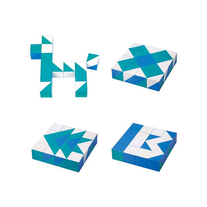 Inspired by scenes of the ever-changing ocean, this set of blocks incorporates colours of the sky, ocean and clouds into simple geometric patterns of triangle and square. The arrangement possibility is endless.