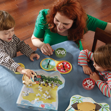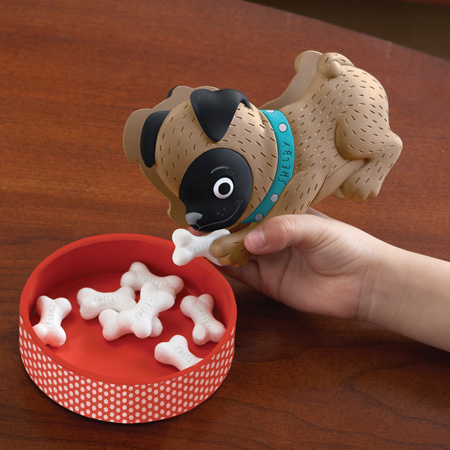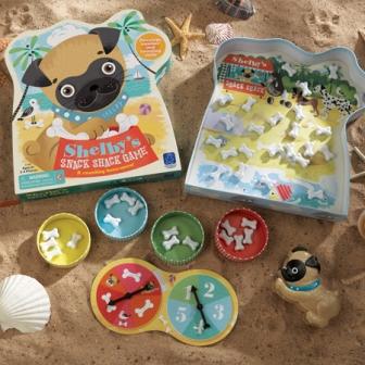 It’s a number and counting bone-anza! This preschool counting bone-anza is a summer day trip to a dog beach! Shelby buried bones in the sand and needs your help collecting them. Help her dig up the most bones and you win! Kids take turns using the adorable Shelby Squeezer to fill their dog bowl with bones. Sounds simple, but be careful—spin a sneaky seagull, and you’ll lose some bones or get sidetracked chewing a flip flop and miss your turn!