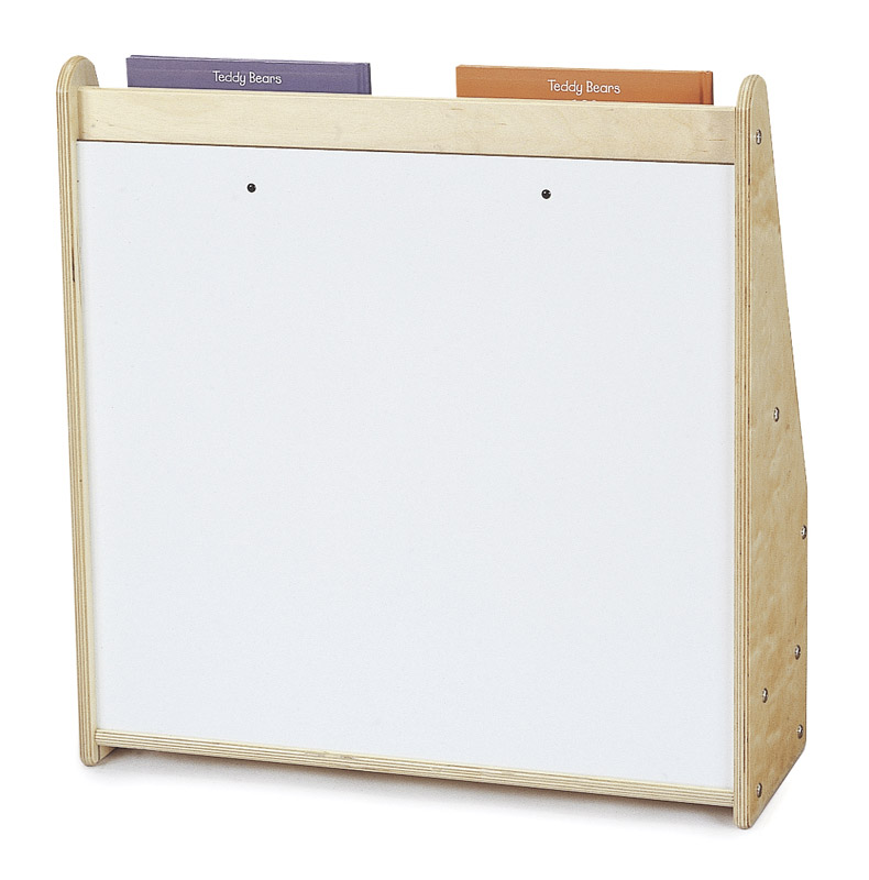 Beginner books at a toddler's height. Three shelves approximately 1 1/2" deep. Added storage below slotted shelves.